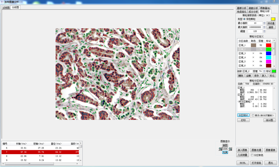 5、颗粒分析:软件自动提取颗粒,并可设置区域,得出每个区域的颗粒数,面积及百分比。